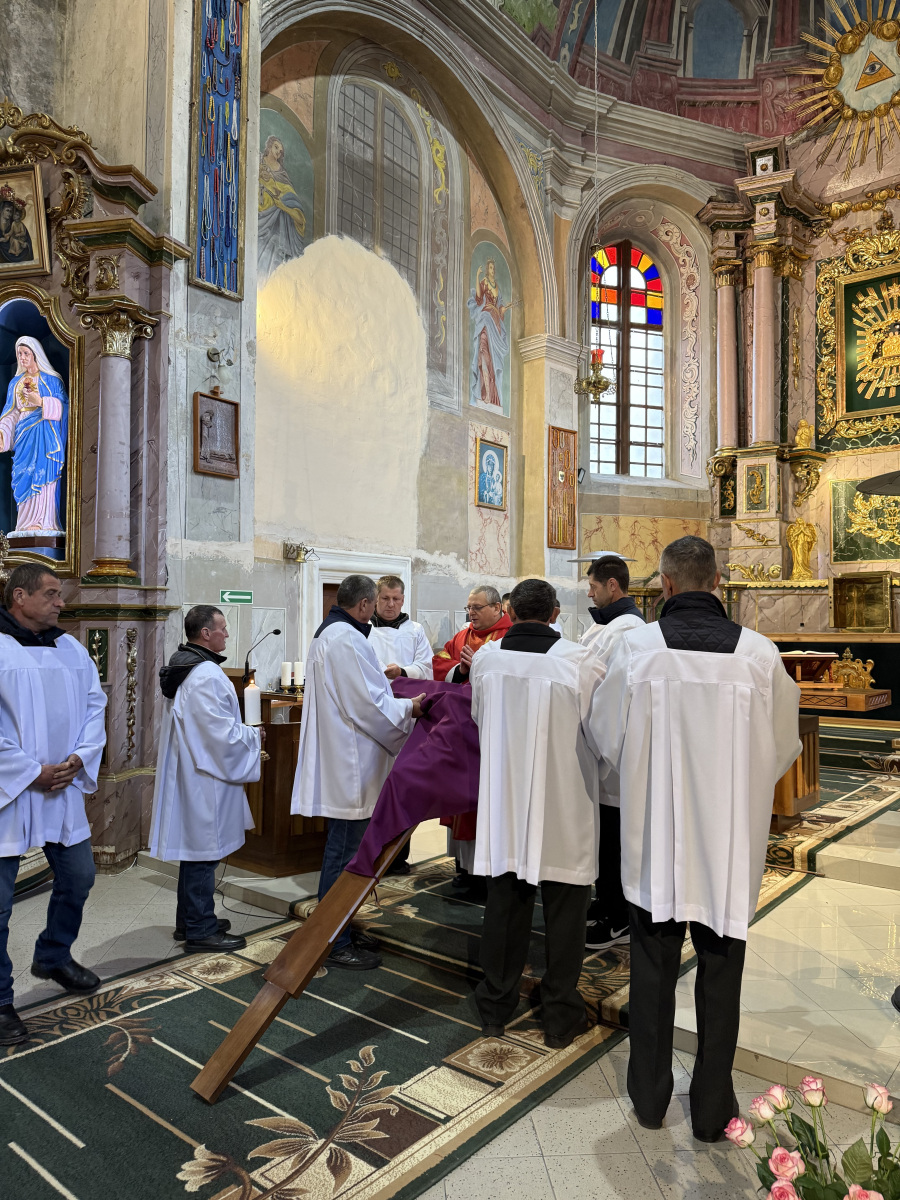 Wielki Piątek, 3 kwietnia 2026 r., był dniem najgłębszej żałoby i ciszy. Adoracja trwała od godziny 10:00 rano. O 17:00 wspólnie odprawiliśmy Drogę Krzyżową, a godzinę później rozpoczęła się Liturgia Męki Pańskiej. Centralnym punktem była poruszająca adoracja Krzyża oraz odczytanie opisu Pasji. Po Komunii św. Pan Jezus został przeniesiony do Grobu Pańskiego. Dzień zakończyliśmy wspólnym śpiewem Gorzkich Żali i adoracją do godziny 22:00.